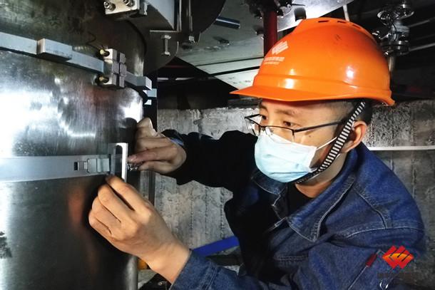 图为该公司青年员工认真检查水力发电机组齿盘测速装置并进行消缺