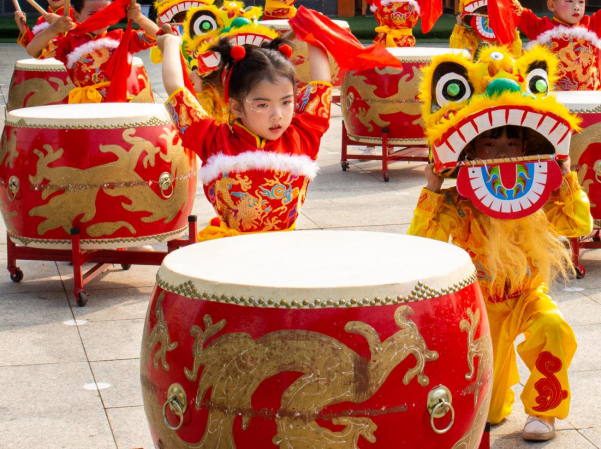 国家能源集团爱心幼儿园的孩子们表演打鼓、舞狮 (朱泽雅 摄)