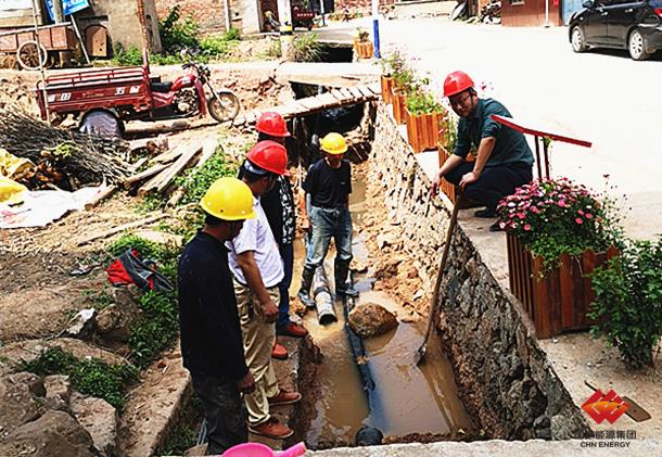 图为该公司驻村干部检查腊坑村污水收集管网施工