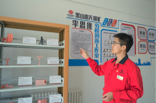 在黑山矿的“李思维劳模创新工作室”里,摆放着两排展架,陈列着这些年创新工作室成员获得的每一个创新成果,还用3D打印机制作了微缩版的模型,标明背景、内容、实施方案和效益预测,一目了然。