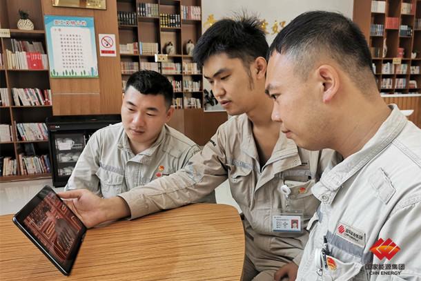 图为海南乐东公司团员青年在图书阅览室收看庆祝中国共产党成立100周年大会盛况