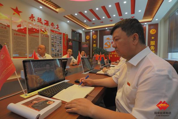 图为新疆公司乌东煤矿党员领导干部在党员活动室收看庆祝中国共产党成立100周年大会