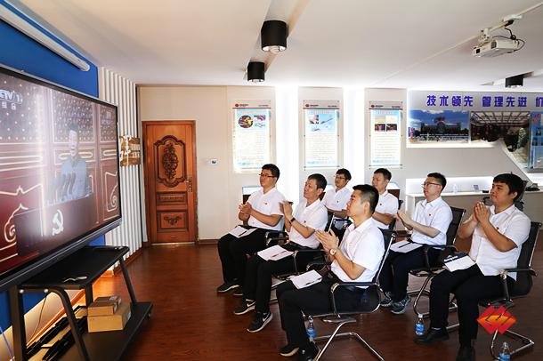 图为神东物资供应中心在厂房收看庆祝中国共产党成立100周年大会盛况