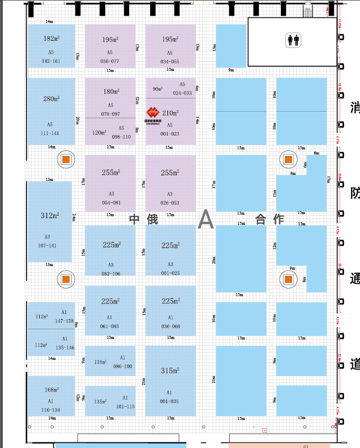 (二)展位情况:计划参展面积210㎡(15m*14m),展位位于哈尔滨国际会展中心A馆,A5 001-023展位,详见展位图。