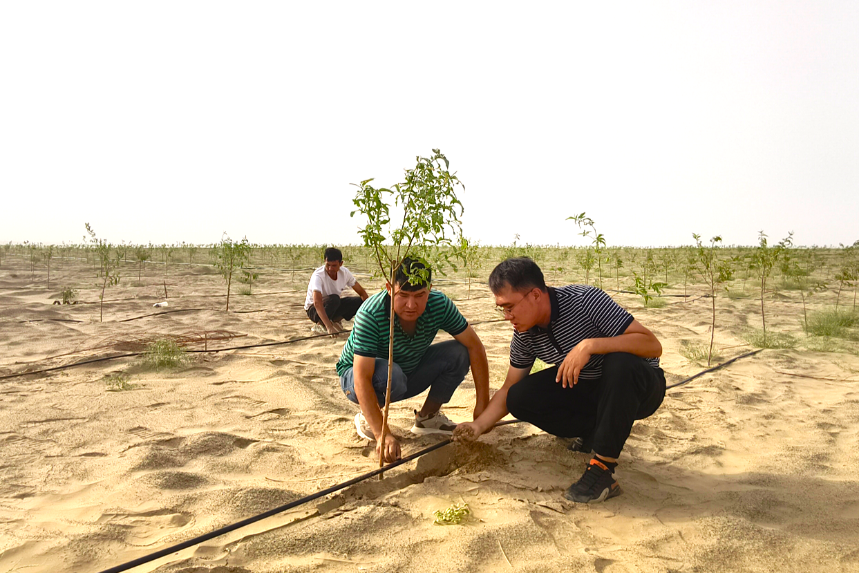在产业振兴的道路上,工作队同样不遗余力。村民麦麦提正忙着给50亩沙漠玫瑰浇水,这是工作队帮扶建设的节水灌溉系统,让曾经寸草难生、白茫茫一片的盐碱地,如今长出了“摇钱树”。“玫瑰花烘干后每公斤能卖200元,沙枣果还能做果酱,这日子真是越过越有奔头了!”麦麦提蹲下身,拨开沙土,露出底下新冒出的桃树苗,脸上洋溢着幸福的笑容。这是工作队创新推出的“防沙治沙+经济作物”复合种植模式,1600亩沙地上,玫瑰、沙枣、桃树相互交织,围护成了一道坚不可摧的绿色屏障,既守护了家园,又带来了财富。