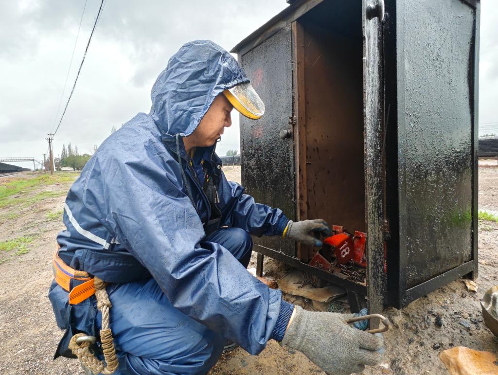 由于雨天视线不佳,调车组作业需要更加专注。他们弯腰检查车钩、俯身确认风管连接,每一个动作都一丝不苟。“一列53辆车下来,得弯腰几十次,雨天更是考验体力。”
